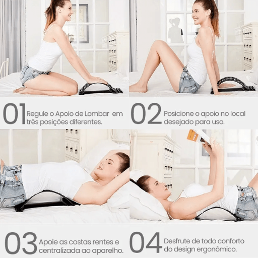 Alivia as dores irritantes causadas por hérnia de disco, abaulamento, estenose espinhal, ciática, nervos comprimidos, escoliose, lordose e diversos outros males que atingem essa região.